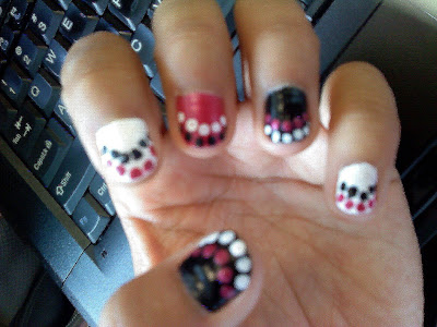 Here is the design that is currently on my nails! Sorry for the poor picture quality! I had to use my phone camera.. Anyways, I have alternating polka dot patterns with 3 different nail bases! I used the end of a bobby pin to make perfect little dots! :) The nail polishes I used to achieve this look were:
